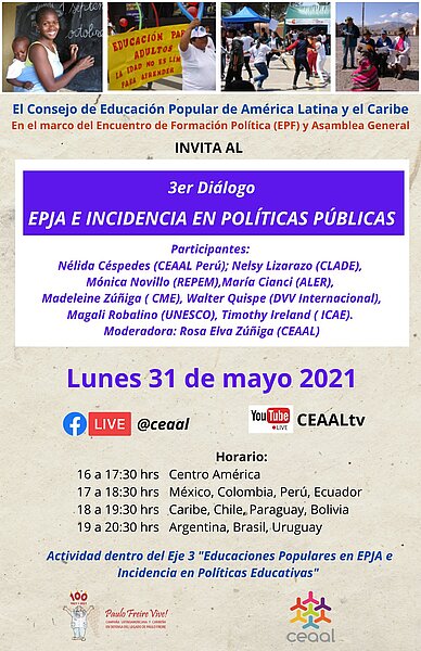 CEAAL realiza la cordial invitación para participar en el 3er diálogo: “EPJA e Incidencia en Políticas Públicas” que se realizará este lunes 31 de mayo de 2021 a las 17:00 (Perú, Colombia, Ecuador).