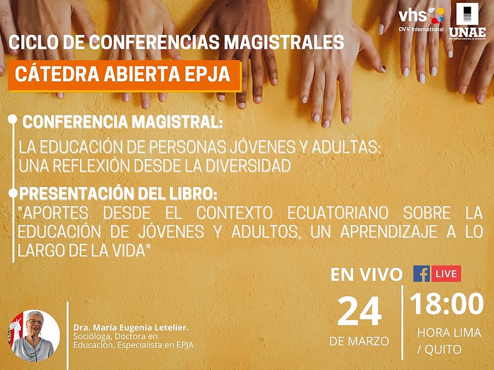 Este miércoles 24 de marzo a las 18:00 (Hora Quito) continúa el Ciclo de Conferencias Magistrales: Cátedra Abierta EPJA, organizado por la Universidad Nacional de Educación (UNAE) y DVV International con destacados conferencistas de amplia trayectoria.