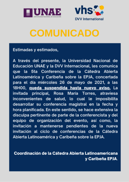 A través del presente comunicado, se informa que la 5ta Conferencia Magistral de la Cátedra Abierta EPJA ha sido suspendida hasta nuevo aviso. Ya que la conferencista Rosa María Torres, se encuentra con un inconveniente en su salud, lo cual no permite desarrollar la Conferencia Magistral en la fecha y hora prevista.