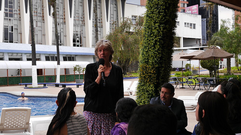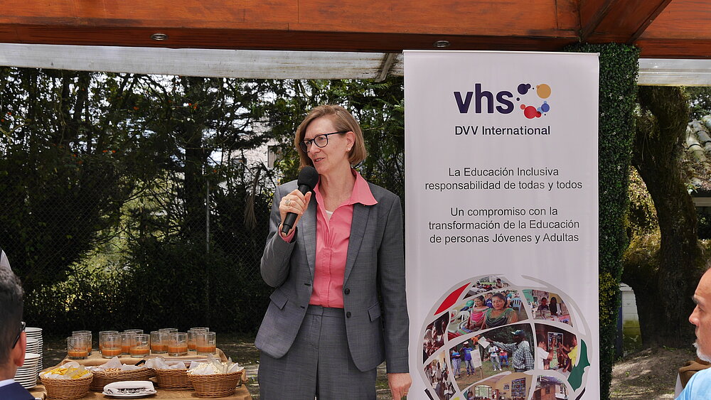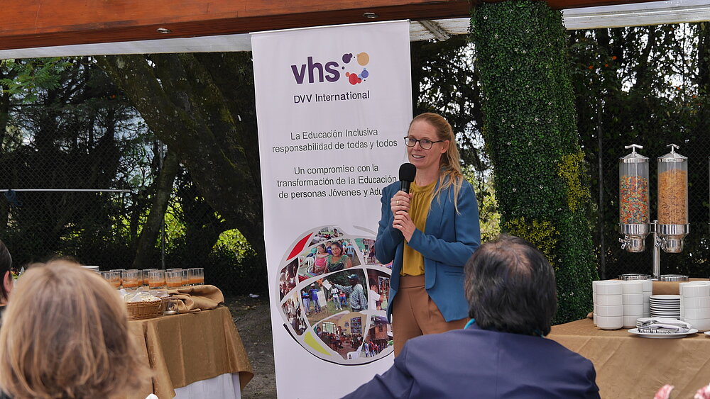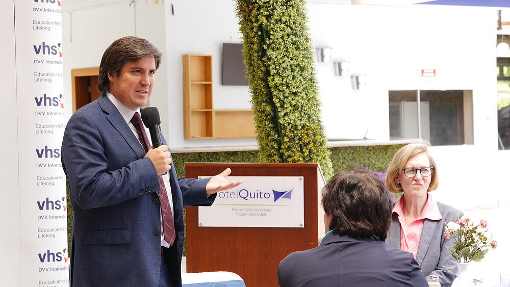 En el programa intervino el señor Daniel Crespo, Subsecretario de Educación en el Educación Especializada e Inclusiva del Ministerio de Educación, quien resaltó el compromiso de la DVV International con el desarrollo de la EPJA. Así también María Cristina Fuentes, Directora de Cooperación no Gubernamental y Evaluación, del Ministerio de Relaciones Exteriores y Movilidad Humana, valoró la importancia de la cooperación para el desarrollo en el contexto ecuatoriano. La señora Barbara Schulz-Hoenerhoff, Jefa de Cooperación de la Embajada Alemana en Quito, habló de la importancia del aprendizaje a lo largo de la vida y su integración en la política exterior de Alemania. Por último, la señora Ana Isabel Delgado, Coordinadora de Proyectos del Programa Ecuador de la DVV International, resaltó el compromiso de la doctora Beate Schmidt-Behlau con el fortalecimiento de la EPJA y auguró éxitos a la señora Meike Woller, en su nueva función.