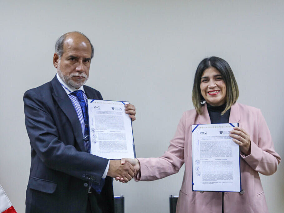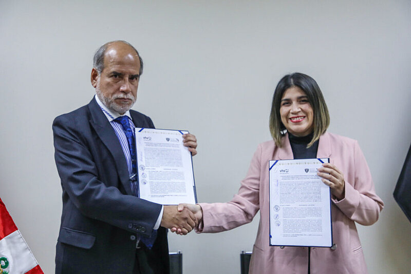 El acuerdo suscrito por Javier Llaque Moya, presidente del Consejo Nacional Penitenciario del INPE, y Jimena Chávez, directora país de DVV International Perú. El acuerdo tendrá una vigencia de cuatro años y beneficiará a los internos de los establecimientos penitenciarios a nivel nacional.
