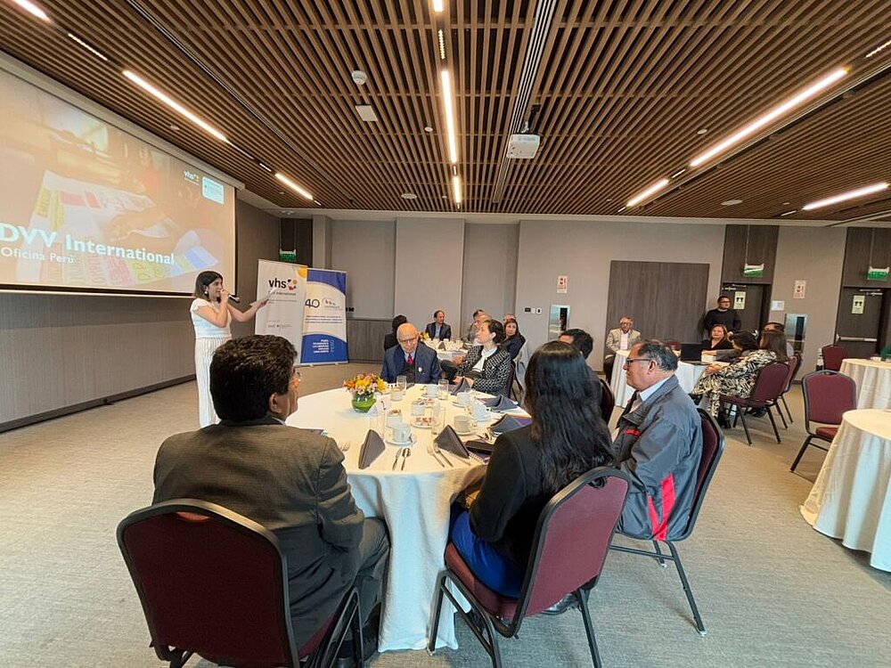 Al día siguiente, el 20 de noviembre, se realizó un desayuno de trabajo con las contrapartes y aliados estratégicos de DVV International, en el que se presentaron los objetivos y las acciones que guiarán el trabajo de la organización en Perú durante los próximos tres años. En este espacio, cada nueva contraparte presentó sus proyectos, los cuales serán implementados en el marco del trienal 2025-2027. Asimismo, este evento permitió fortalecer la articulación entre instituciones del Estado, el sector privado, la sociedad civil y la academia.