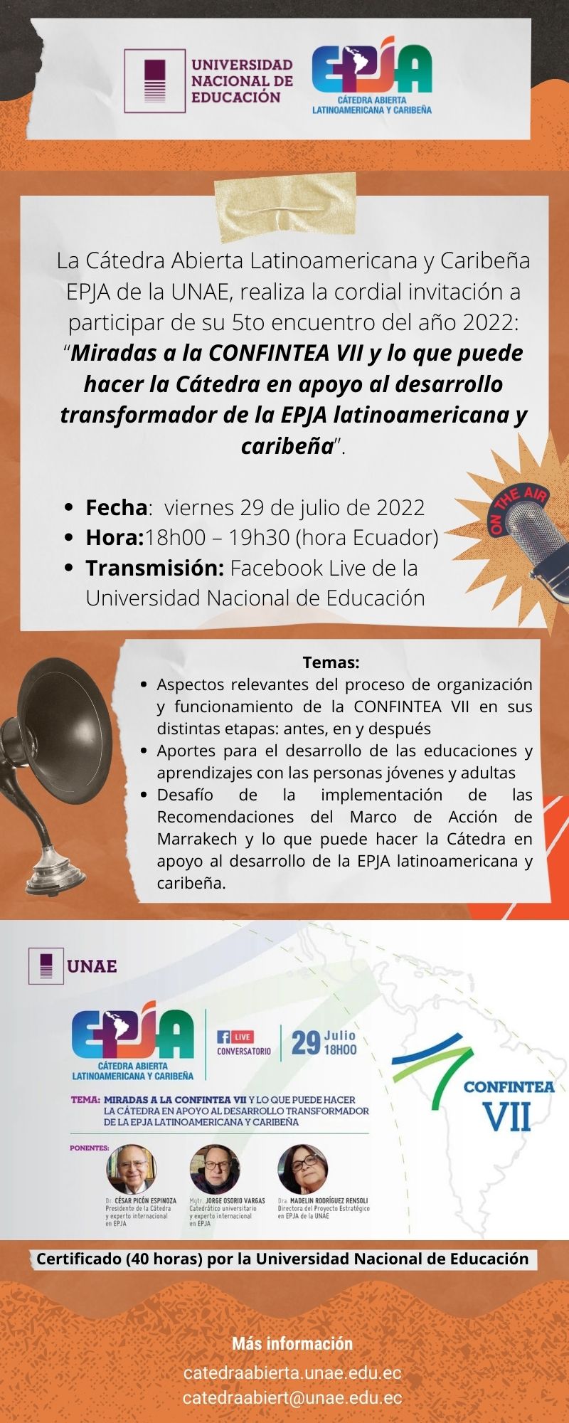 La Cátedra Abierta Latinoamericana y Caribeña EPJA, de la UNAE, realizará su quinto encuentro del año 2022, el viernes 29 de julio, a las 18h00 (Ecuador), a través del Facebook Live de la…