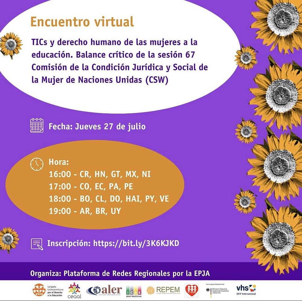 La Plataforma de Redes Regionales por la EPJA invita al Encuentro Virtual "TIC y derecho humano de las mujeres a la educación. Balance crítico de la sesión 67 de la Comisión de la Condición…